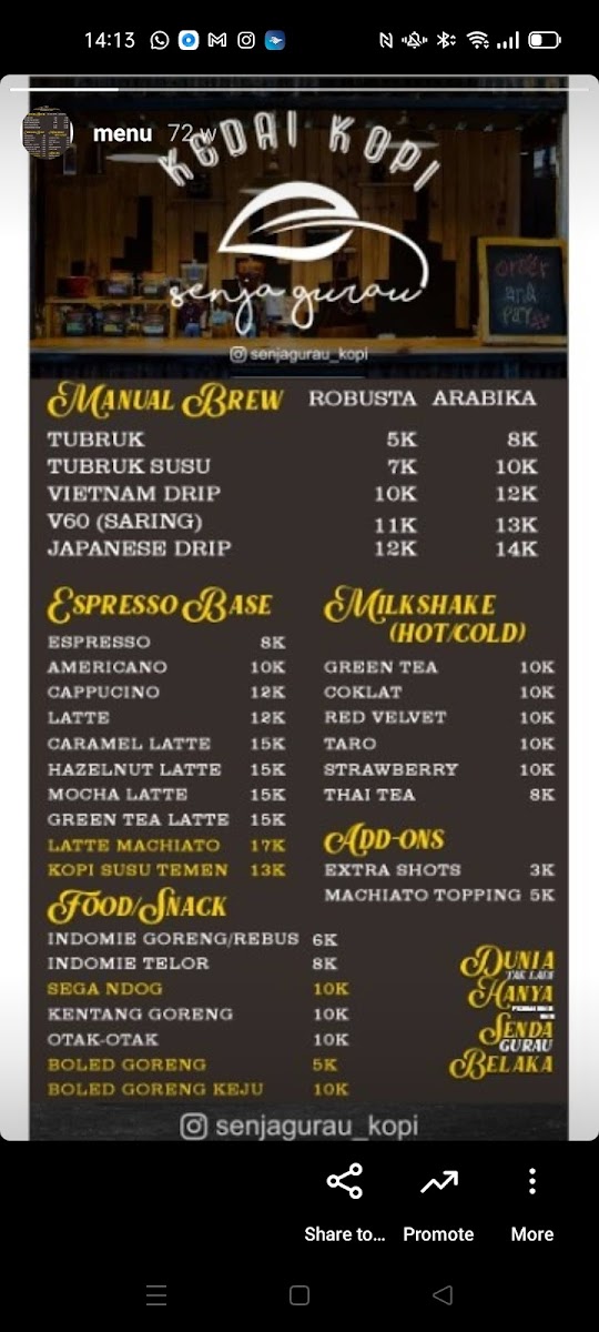 With a spacious setting and friendly service, it’s an ideal place for students and friends to unwind. Whether you’re on a work break or simply looking to enjoy great coffee, Senja Gurau Kopi is your go-to spot in Purbalingga.